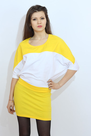 ОписаниеПлатье в стиле color-block выполнено из сочетания желтой и белой ткани. Рукава в форме "летучая мышь". Идеально подойдет для вечеринки!